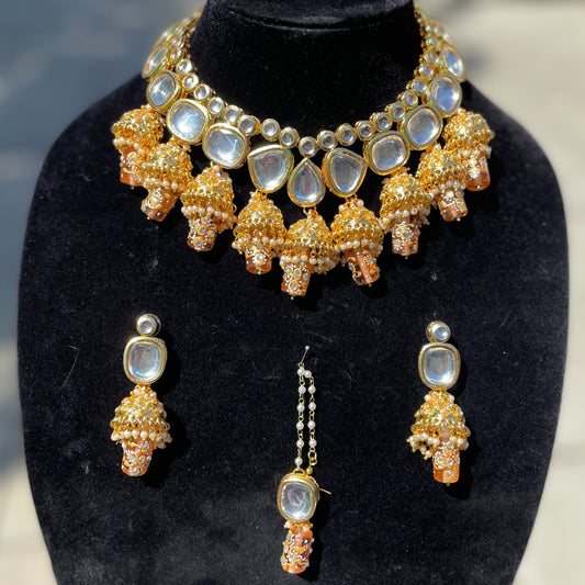 Clear Peach Jhumki Kundan Necklace Set