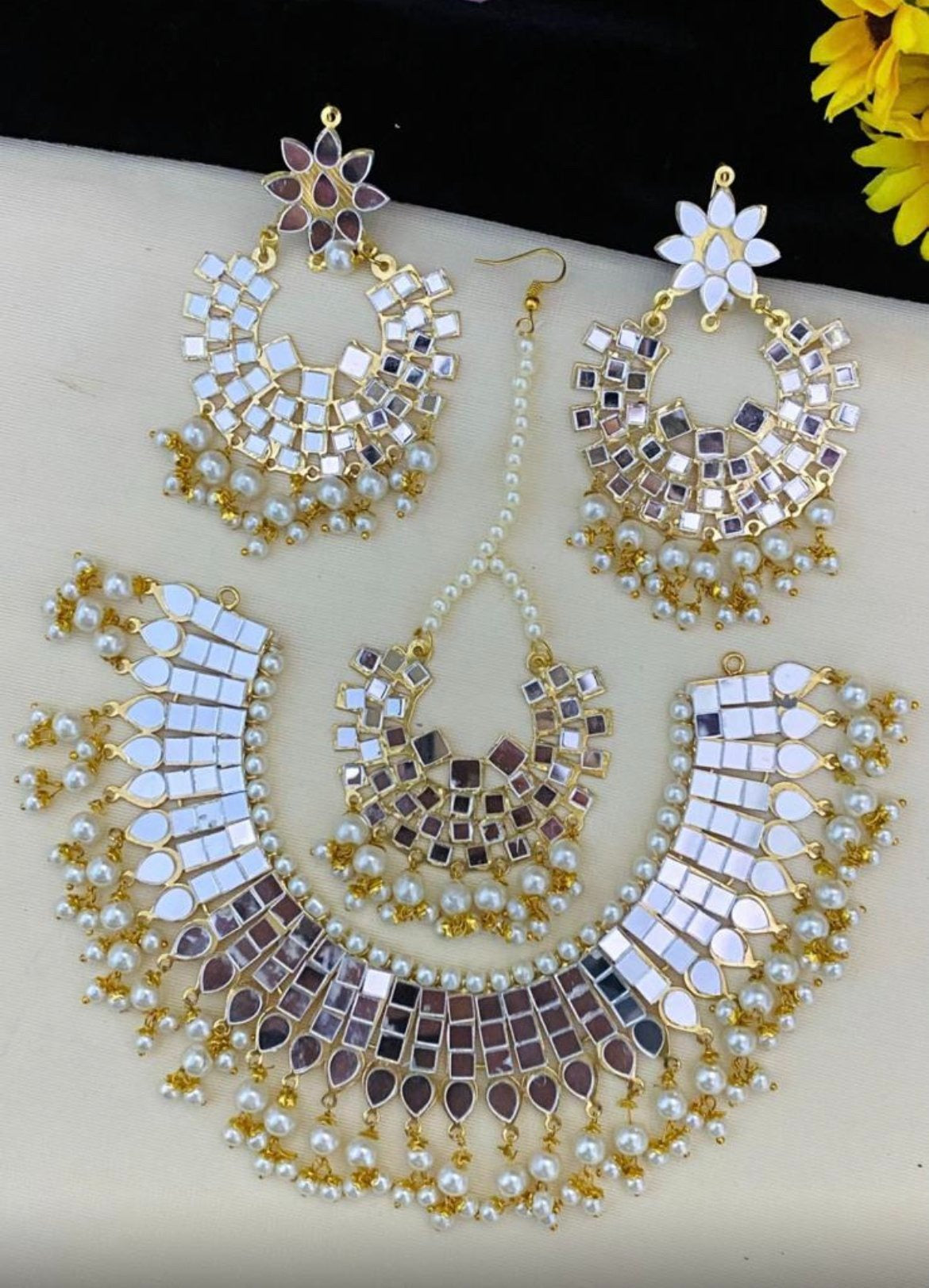 This stunning mirror (sheesha) necklace set comes with necklace, earrings, and maang tikka. Never seen before! Ready to ship right to your door!